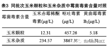 饲料原料中混入了大量的杂质,如不事先清理,就会影响产品质量,甚至影响动物的生产性能,在加工过程中损耗设备,影响生产。目前谷物类原料,如玉米在饲料配方中占有绝对大的比例(高达70%左右),由于玉米含有较多玉米秸秆、穗轴、玉米芯、根茬以及沙粒等杂质,这些杂质的比例一般在0.5%~2%之间,有的甚至高达3%以上,为霉菌、细菌以及害虫提供了适宜的生长环境。经检测发现,玉米经过除杂后杂质的霉菌毒素含量远远高于玉米本身霉菌毒素含量(见表3)。