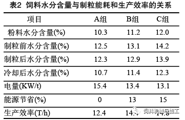 保水设备工艺技术的不断成熟,能调整教槽料、乳猪料水分至适宜水平,改善颗粒硬度,同时,解决了因饲料入模水分低时颗粒表面与模孔内壁、压辊产生强烈,大量机械能转为热能被消耗的问题,降低了能耗,提高生产效率(见表2)。
