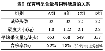 在配合饲料的加工过程中,制粒是其中的重要环节,起着承上启下的作用。此工艺过程一般由预处理(磁选、液体添加、调质)、制粒和后处理(冷却、破碎、分级)三大部分组成,物料经过制粒工段后由粉料转变为颗粒料。在此环节中,既要考虑生产效率,又不能影响产品的品质,需确保产品颗粒硬度、含粉率、溶水性、冷却后料温等各项物理指标。当一个产品的配方设计成型后,在生产过程中往往出现工艺不符的情况而使产品不能达到预期的设计效果。以教槽料为例,由于配方中含有大量的乳制品和糖分,在制粒过程中容易出现堵机、黑料及颗粒偏硬现象,从而导致产品在使用过程中出现猪只不喜食和腹泻等情况的发生。如果冷却器性能不良或冷却时间不够等原因,容易导致颗粒饲料在保质期内发生霉变。经研究发现,同配方产品不同颗粒硬度对猪的采食量有着一定的关联性(见表6)。影响饲料硬度的主要因素除配方中原料特性外,其使用的环模长径比、制粒温度的控制也至关重要。相关试验究表明,饲料颗粒硬度低,猪只采食量最高,但含粉率过高会导致饲料重复循环制粒、饲料浪费等不利因素,因此应选用相匹配的长径比、环模及最合适的调质参数,以达到最佳的颗粒质量。设备的改进(硬件)与先进的技术及生产管理(软件)组成科学的生产工艺。先进的饲料加工工艺不是简单几个豪华“大件”的积木,更应重视细节的衔接和使用的顺畅,重视关键部件的精细化处理。对不符合饲料生产工艺条件的设备、尤其是老设备,应在充分论证后进行改造更新,达到改善生产工艺提高饲料品质的目的。