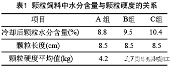 饲料生产过程中必须关注的问题有:①如何减少饲料中霉菌和细菌总数;②如何提高制粒质量;③如何降低粉尘;④如何提高单班生产效率,降低加工能耗;⑤如何充分有效的利用蒸汽,并冷却充分,保持饲料中适宜的水分。以上几点都与物料水分的高低有关,可见在饲料中保持合适水分的重要性。而饲料的水分受天气及原料的影响,在一年中的各个季节波动很大。较为合适的水分含量,能保证较好的颗粒质量(如糊化度、颗粒硬度、粉化率、溶水性等),同时也能降低机械的磨损、减少能耗,提高设备使用年限和生产效率。所有饲料的配方均以88%作为干物质基础,这意味着饲料水分含量理论上应为12%。而在实际生产中,由于原料水分及季节的变化,饲料成品的水分含量一般在8%~13%之间波动,尤其是在夏、秋高温季节,水分散失很严重(0.5%~3%)。水分过低会影响饲料的适口性,导致颗粒过硬并引起采食量、消化率降低等严重问题。以教槽料为例:该产品生产出来水分仅有8%~9%,因水分过低影响到淀粉的糊化,出现硬度偏大,采食量降低的现象,进而影响动物的生长性能。为解决配合饲料水分过低和颗粒质量问题,通过使用饲料保水设备来改善工艺,即将表面活性剂与适量水的混合液通过设备均匀喷洒到混合机中物料的表面,达到增加饲料水分的目的。经反复试验,可使教槽料水分提高至10.5%左右,提高了淀粉糊化程度并能够有效缓解颗粒硬度,从而大大提升了饲料品质(见表1)。