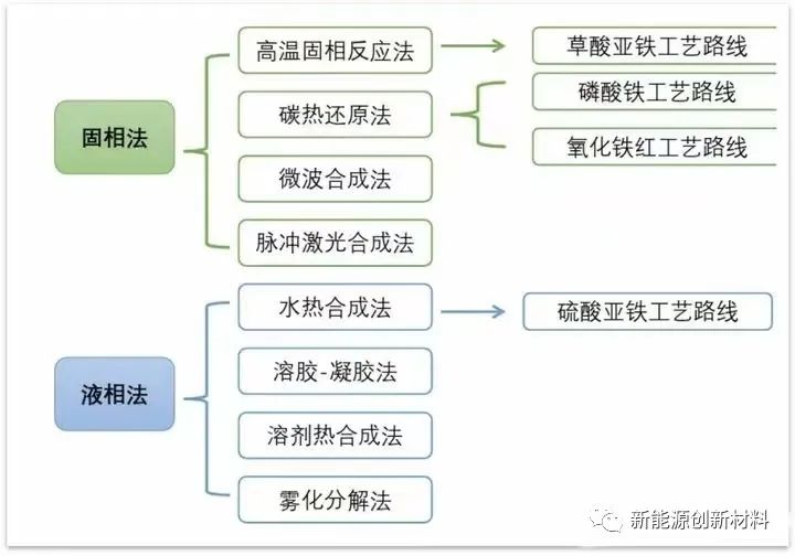 磷酸铁锂制备工艺多样,主要分为固相法,液相法这两大主流工艺。固相法是目前最成熟也是应用最广的磷酸铁锂合成方法,液相法工艺难度较大。锂盐: 碳酸锂LiCO3、氢氧化锂 LiOH、醋酸锂CH3COOLi,铁源:草酸亚铁FeC2O4.H2O;草酸亚铁Fe(CH3COO)2,磷源 : 磷酸二氢铵 NH4H2PO4、磷酸氢二铵 (NH4) 2HPO41、 草酸亚铁纯度低,副产品FeSO4 很多,放置一段时间三价铁会比较多。2、 草酸亚铁原料形貌控制非常困难,导致成品磷酸铁锂加工性能较差。3、 由于采用三种原料,混料的均匀性控制差,容易氧化,对烧结炉的气氛保护气筒要求较高。4、 工艺路线能耗高,生产周期长,排除的氨气有污染,产品的烧成率低 于50%,成品率过低。锂盐:碳酸锂Li₂CO₃、氢氧化锂LiOH、醋酸锂CH₃COOLi湖南裕能,国轩高科、湖北万润,安达科技,龙蟠科技,丰元锂能等1、 可实现一次球磨、 一次干燥和一次烧结,工艺简单,能耗少;2、 烧成率接近70%,原材料易混合均匀,颗粒较细;1、磷酸铁锂材料性能严重依赖磷酸铁原料的品质,原材料的铁磷比不可控。2、 磷酸铁一项就达到原料成本的50%以上,必须大幅消减成本,才能让其优质的电性能和市场价格相匹配。2、该工艺路线生产的磷酸铁锂形貌可控,加工性能最好,3、 因采用两种原料,混料均匀性控制较好,无需考虑三价铁源在干燥过程中的氧化问题,稳定性控制较好。只需要采用一次烧结,工艺流程简单,易控制,成品率高达80%左右。2、磷酸二氢锂中的磷酸根和锂不易实现准确化学计量比。锂盐:碳酸锂Li₂CO₃ 、氢氧化锂 LiOH、 醋酸锂CH₃COOLi1、锂的摩尔投入量是铁的三倍,需考虑锂的回收,回收成本高;2、对反应釜的温度、压力、耐腐蚀性能等要求高,难以大规模批量生产。1,草酸亚铁路线仍然是目前最主流的合成路线,但设备依存度较高,生产周 期比较长,形貌调控问题是该路线的难点,导致稳定性不理想。2,氧化铁工艺路线比较成熟,产业化基础强,稳定性好,成本和性能方面都 有较大的优势;3,磷酸铁路线成本比较高,仅磷酸铁一项就达到原材料成本的50%以上,必须大幅削减成本,才能让其优质的电性能和市场价格相匹配。Duan等人制备纳米级纳米磷酸铁锂。当粒子直径在83,42nm时,对应的磷酸铁锂由于表面C-O-Fe化合键的作用,克容量可以分别提升到186和207mAh/g。间勇等发明了一种复合补理剂,利用其在磷酸铁锂电池中使用,可以有效补偿因负极SEI膜消耗引起的锂离子损失,将磷酸铁锂的放电比容量从140提升到155mAh/g。张淑萍等利用塑型剂制备磷酸铁锂,可以制成压实密度比常规材料高0.1-0.4g/cm3的正极材料。最高可以达到2.65g/cm3刘瑞龙等 通过引入表面活性剂制备磷酸铁锂,可以制成压实密度达到2.65g/cm3的正极材料利用特殊结构磷酸铁锂材料和低温型电解液,制成的圆柱形26650离子电池,可以在-50℃放电,并可以在-40℃实现5C放电。证明磷酸铁锂可以实现良好的低温性能!聂国昌等.超低温圆柱形磷酸铁鲤电池的研发,当代化工研究,2022,23: 141-144手段:致密包覆,比表面积降低到10m2/g以下,粒度D50控制在2-3um技术路线:寻找新的包覆剂,改用新型包覆系统,控制材料形貌和表面状态(复合包覆、致密包覆、二次包覆、单晶化)手段:稳定晶格结构,表层的铁离子强络合技术,致密层包覆技术路线:寻找新的掺杂稳定技术,控制铁离子的溶出,调控材料表面状态张世庆等提出了一种制备高倍率磷酸铁锂材料的方法。该技术用研磨时产生的热量进行结晶析出,进行物料的充分混合使得所制备出的产品具有更为圆润的形貌和更优良的碳包覆层,5C放电容量达到132mAh/g。陈伟民等使用聚苯胺 (PANI) 包覆LiFePO制备复合材料,0.2C倍率放电160.7mAb/g5C倍率放电114.2mAh/g。专利CN113540410A提出一种高温固相热冲击方法合成磷酸铁正极材料方法,将传统的烧结时间10小时缩短到20s左右。10,改性磷酸铁锂:提升电压,包括:磷酸锰铁锂、磷酸钒锂1、德方纳米:采用全湿法工艺,是国内唯一成熟的全湿法工艺厂商。深圳市德方纳米科技股份有限公司(简称:德方纳米)公司成立于 2007 年,聚焦锂电池正极,积极研发新产品。公司主要产品为纳米磷酸铁锂,属于锂电池正极材料,材料性能处于国际领先水平;同时在原有产品的基础上,公司推出新一代正极材料磷酸锰铁锂,提升了电压平台和低温性能,适用于动力类应用领域。另外,公司研发新品补锂剂,主要用作正极添加剂,可提升锂电池的首效、能量密度和循环性能。2、 湖南裕能:采用固相法磷酸铁工艺,工艺简单,设备投入成本低。湖南裕能新能源电池材料股份有限公司(简称:湖南裕能)于2016年6月成立,公司专注于打造性能优越、品质稳定的高端电池级磷酸铁、磷酸铁锂、镍钴锰三元材料等正极材料研发、生产和销售,主要应用于动力电池、储能电池等锂离子电池的制造,最终应用于新能源汽车、储能等领域,公司与国内众多知名高端电池企业形成长期稳固合作。湖南裕能下辖有五个生产基地(湖南、广西、四川、贵州和云南)。3、 重庆特瑞:采用低成本的铁红工艺,是西南片区磷酸铁锂电池材料最大的制造商。重庆特瑞电池材料股份有限公司(简称:重庆特瑞)成立于 2007 年,专注于环保新能源锂电池正极材料的研发、生产与销售。据公司官网介绍,公司于 2017 年,总投资规模超过 30 亿元的“十万吨锂离子电池正极材料项目”一期工程正式投产,总生产能力超过 2 万吨/年,产品涵盖磷酸