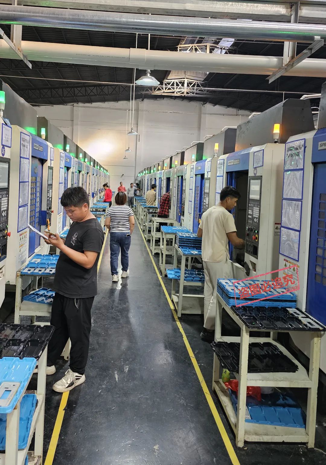 两班倒岗位众多,男的部分开机CNC机台,高光机等,机台无 水,车间干净整洁,