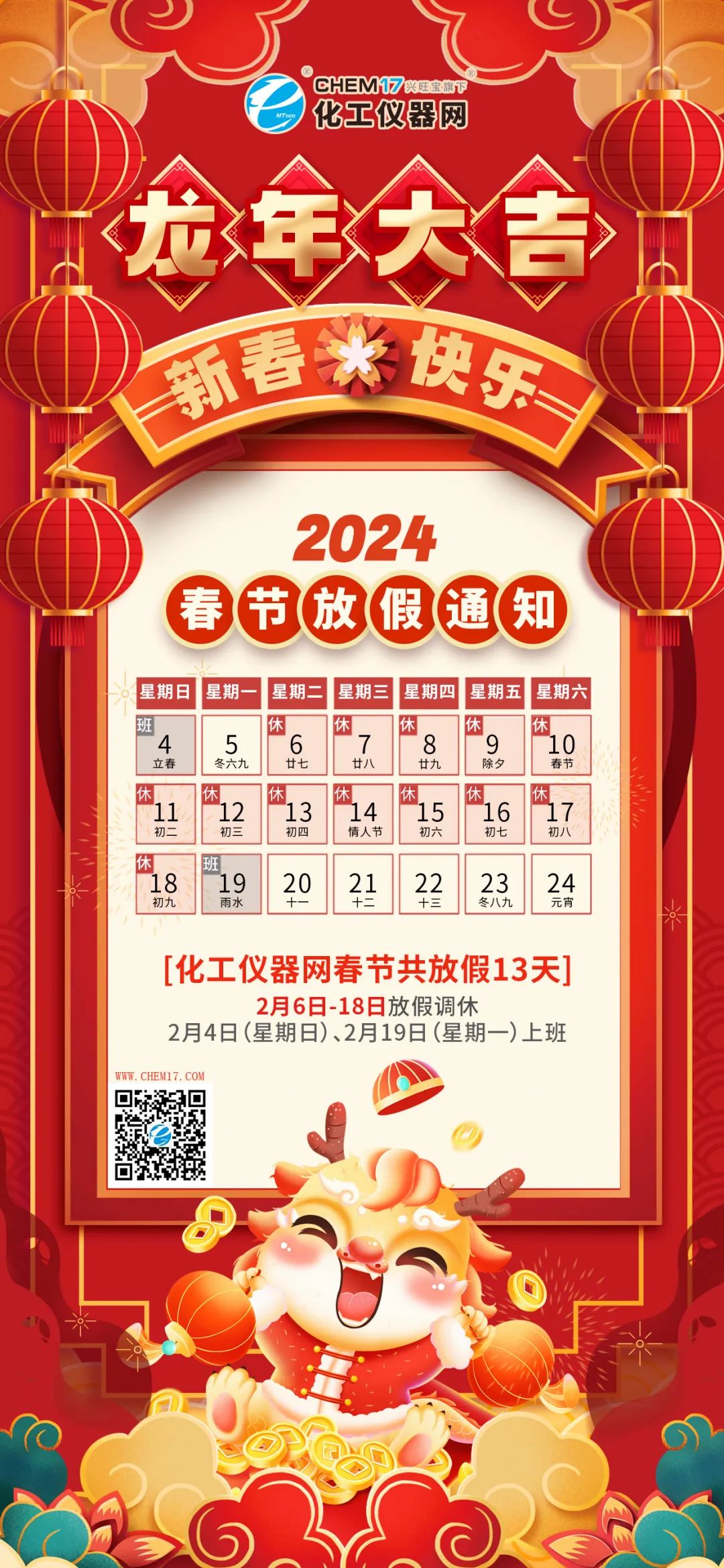 一、化工仪器网2024年春节放假时间为:2024年02月06日-2024年02月18日,共13天。2月19日(周一)正常上班。