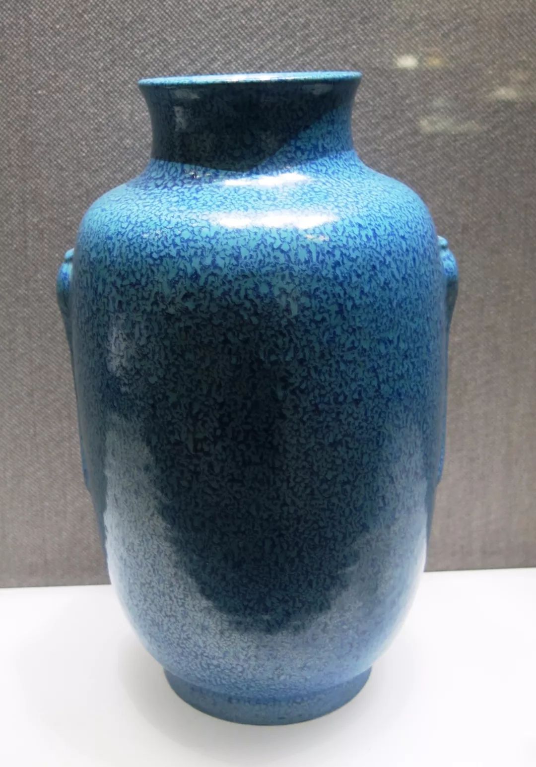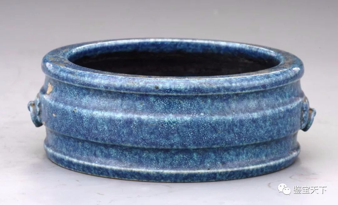清代末期炉钧釉瓷又颇具特色,分素炉钧与荤炉钧两种。素炉钧即不带红色的炉钧釉。其釉面的色泽仍是以深浅不一的蓝色为主,独特之处在于:其深色蓝釉地上密布着浅蓝色的斑点,不仅小如鱼籽,且布局绵密。
