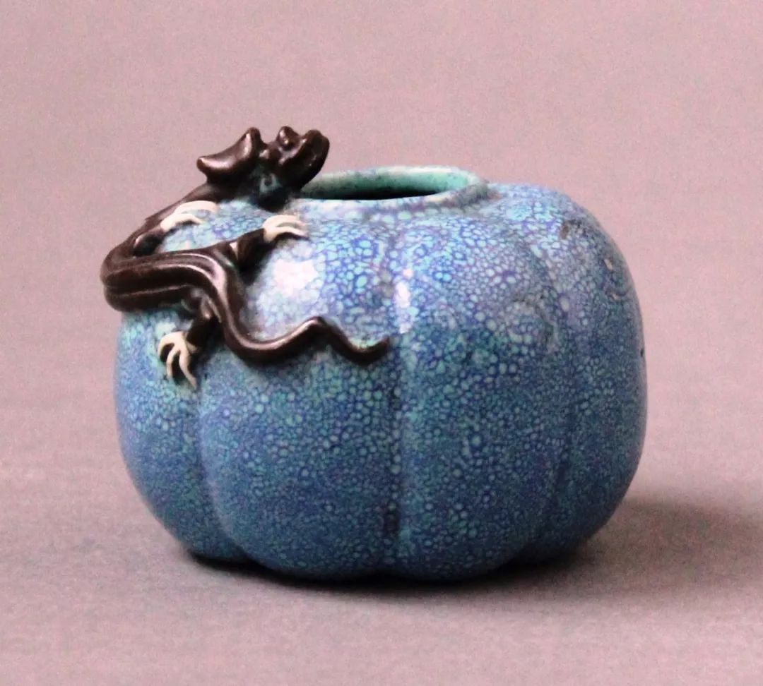 典型如北京艺术博物馆藏这件清道光炉钧釉塑螭虎纹瓜棱水盂,高4.5厘米,口径2厘米,底径4.5厘米。水盂为小口,鼓腹,平底。腹部为瓜棱式,口部堆塑一条螭虎。水盂通体内外施炉钧釉,螭虎身上饰酱釉,四爪为白釉,色调对比强烈而又相得益彰,显得格外玲珑可爱,雅致宜人。