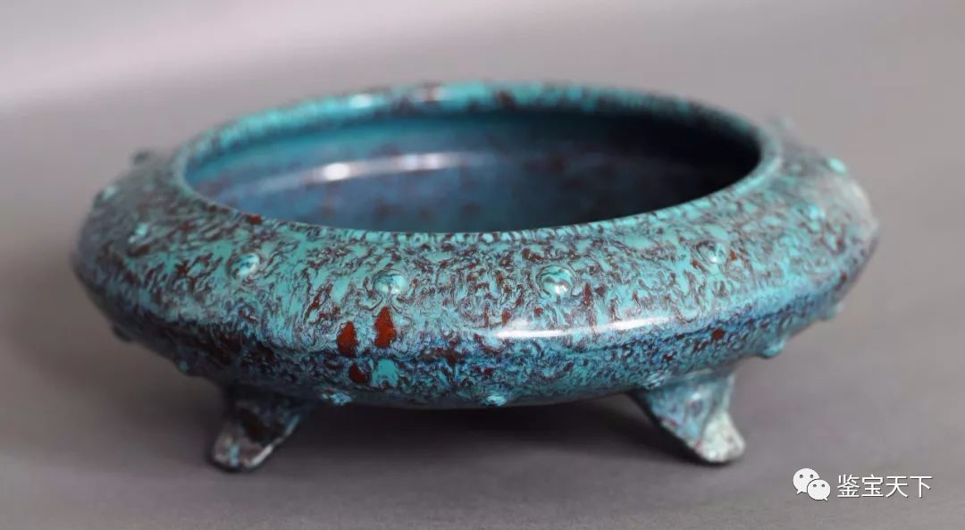 以北京艺术博物馆藏这件清雍正炉钧釉鼓钉纹三足炉为例,高5.7厘米,口径11.4厘米,腹径16.2厘米。洗口内敛,腹部扁圆,下承三个兽首形足,圜底。外腹部上下各装饰一圈凸起的鼓钉纹。外底部暗刻“雍正年制”四字双行篆书款。制作规整,造型端庄古雅。炉的内外通体施炉钧釉,釉面滋润,如缕如丝的松石绿条纹与高梁穗般紫红斑点相互交融,蜿蜒流淌,给人以变化莫测之感。