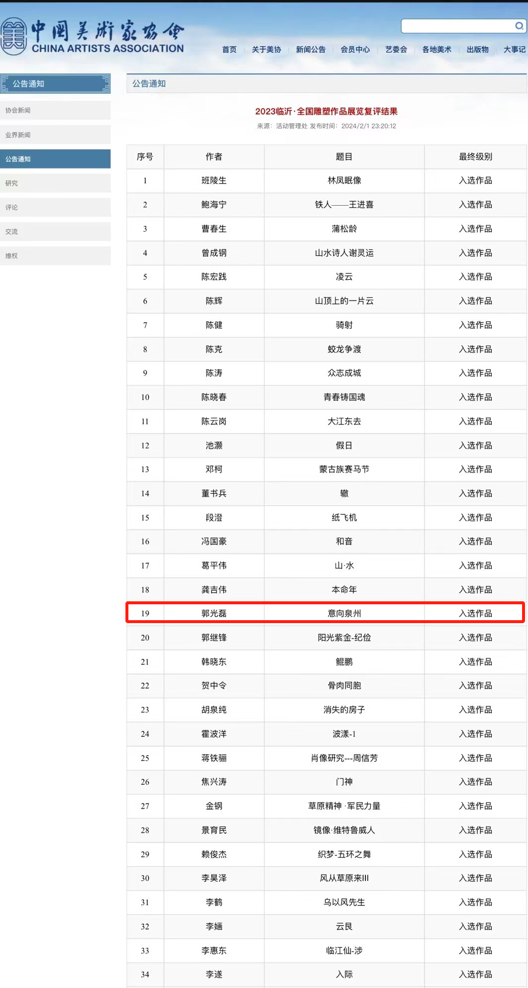2月1日,2023临沂·全国雕塑作品展览入选作品复评结果公布,莆田学院工艺美术学院教师郭光磊雕塑作品《意向泉州》成功入选。