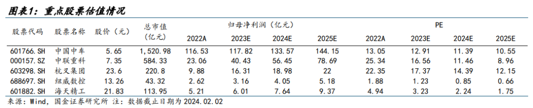 我们建议持续重视轨交装备、工程机械、叉车、工业母机等低估值方向。建议关注中国中车、中联重科、杭叉集团、纽威数控、海天精工。