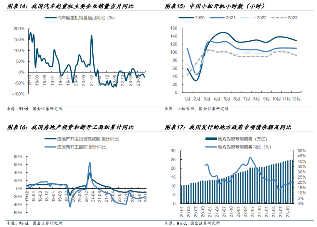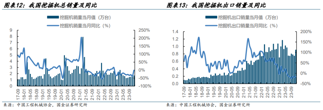 根据中国工程机械工业协会数据,23 年中国挖掘机主要制造企业挖掘机销量为 19.5 万台,同比-25.4%;国内销量约 9 万台,同比-40.8%;出口销量 10.5 万台,同比-4%。逐月分析来看,23 年下半年挖机出口销量增速有所回落,主要系海外需求放缓、渠道去库存、部分地区高基数等因素影响,但目前工程机械主机厂在欧美地区市占率仍处于较低水平,中长期仍具有较大进口替代空间。工程机械1-3Q23业绩增速超过收入增速,主要得益于工程机械主机厂海外占比提升,海外市场盈利能力远超国内市场。得益于产品结构优化和成本下行,国内工程机械主机厂盈利能力明显回升,从而有望带来利润大幅增长。展望24 年,国内挖机销量企稳,出口虽整体有压力、但仍具有韧性,我们看好近年积极布局海外市场主机厂,如中联重科、徐工机械。