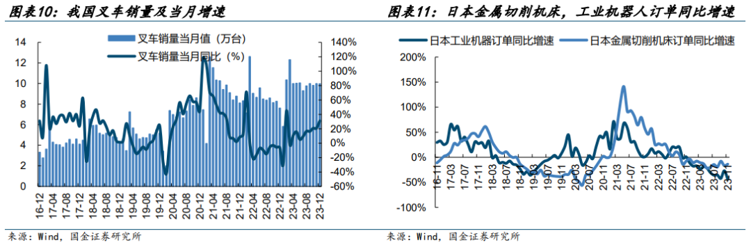 预计23年叉车板块业绩有望大幅增长。国内制造业需求在经历2022年筑底后、2023年开始进入复苏通道,但实际上2023年需求仍然表现疲软,产品需求分化。其中,受益于电动化和国际化的叉车板块表现较强。根据中国工程机械工业协会数据,23年叉车销量117万台、同比+12%,其中内销76.8万台、同比+11.93%;出口销量40.5万台、同比+12.14%。结构上,剔除三类车,我们估计23年我国叉车电动化率约33%、同比+4pct。受益于原材料价格下降、汇率贬值以及电动化占比提升,叉车板块利润增长持续超预期。杭叉集团发布业绩快报,预计23年净利润约16.0亿元~18.0亿元,同比增长61.98%~82.23%。我们判断安徽合力23年利润也有望大幅增长。展望24年,国内在环保政策收紧趋势下,有望加速高价值量锂电叉车渗透率提升,从而带动内销持续增长。海外以北美、东南亚为首的市场需求仍然旺盛,国产龙头海外渠道布局进入收获期、有望凭借锂电叉车实现弯道超车,国际化份额持续提升。因此,我们继续看好低估值、高成长、强现金流的叉车板块。