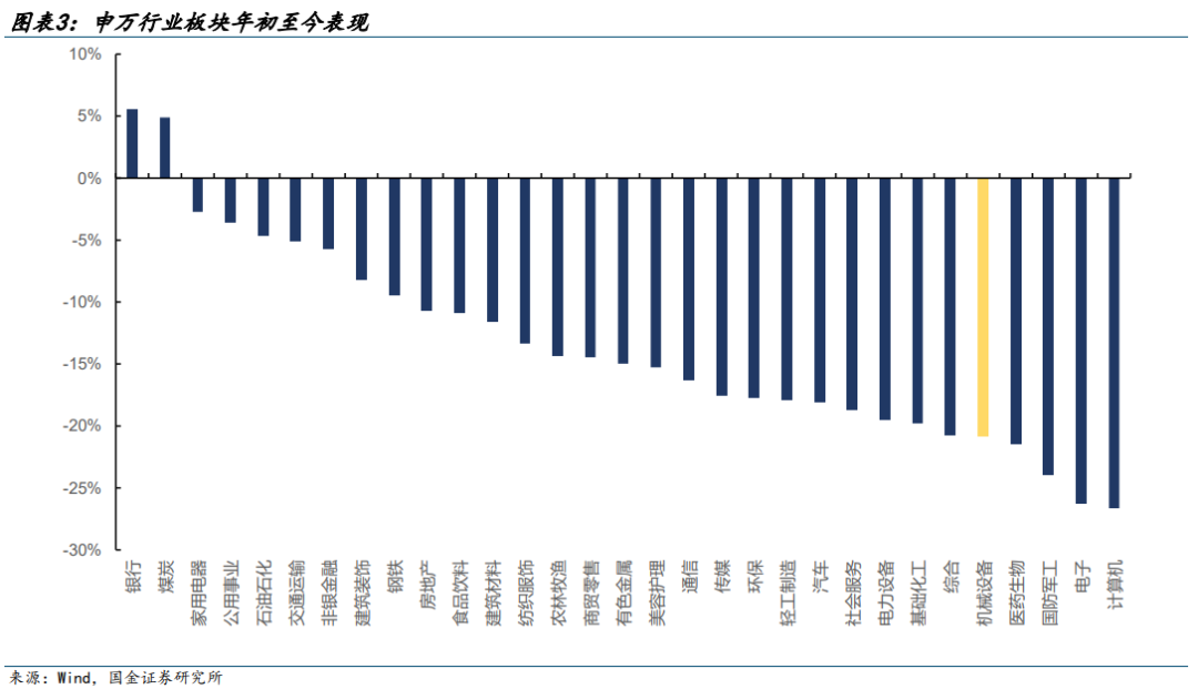2024 年至今表现:SW机械设备指数下跌20.83%,在申万31个一级行业分类中排名第27;同期沪深300指数下跌7.33%。