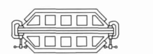 另一个常用的平衡收缩力的方法是将同样的焊接工件相对放置,并将其夹紧。预弯也可采用此种方法,在夹紧前,将楔子放置在工件的适当位置。