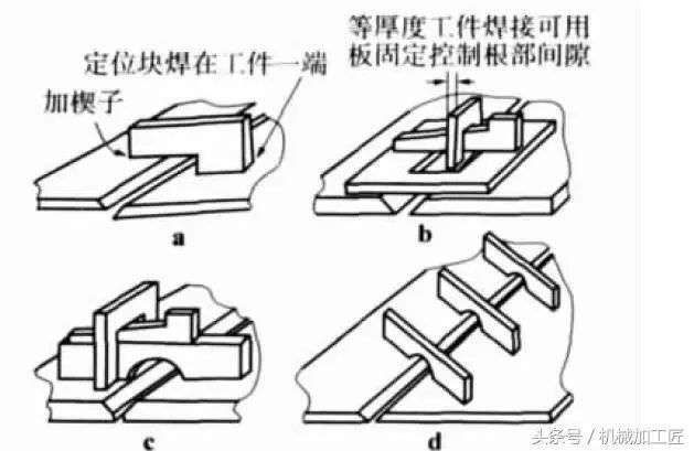 “定位板”是钢板对焊时的一种有效控制焊接变形的技术,如图 所示。定位板的一端焊在工件的一块板上,另一端将楔形块楔入压板,甚至可采用多个定位板排列,以保持焊接时对焊接钢板的定位、固定。