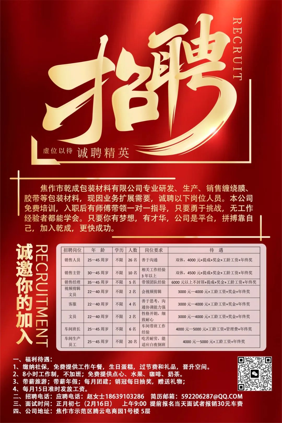 车间生产员工20名:25—45周岁,学历不限,吃苦耐劳,能适应白夜倒班。待遇:4000元—5000元+工龄工资+年终奖。