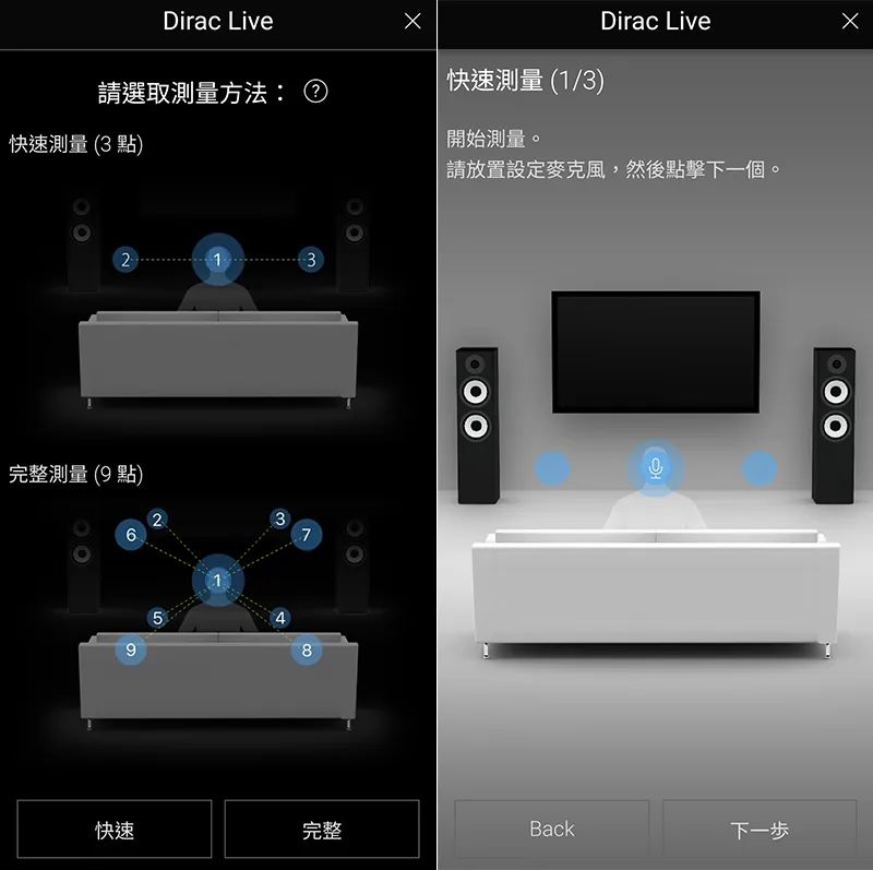 图左:要快速的话,量 3 个点就好,讲究的就选完整测量,共 9 个点。图右:画面中会指引麦克风摆放的位置,照着做就对了。 |
