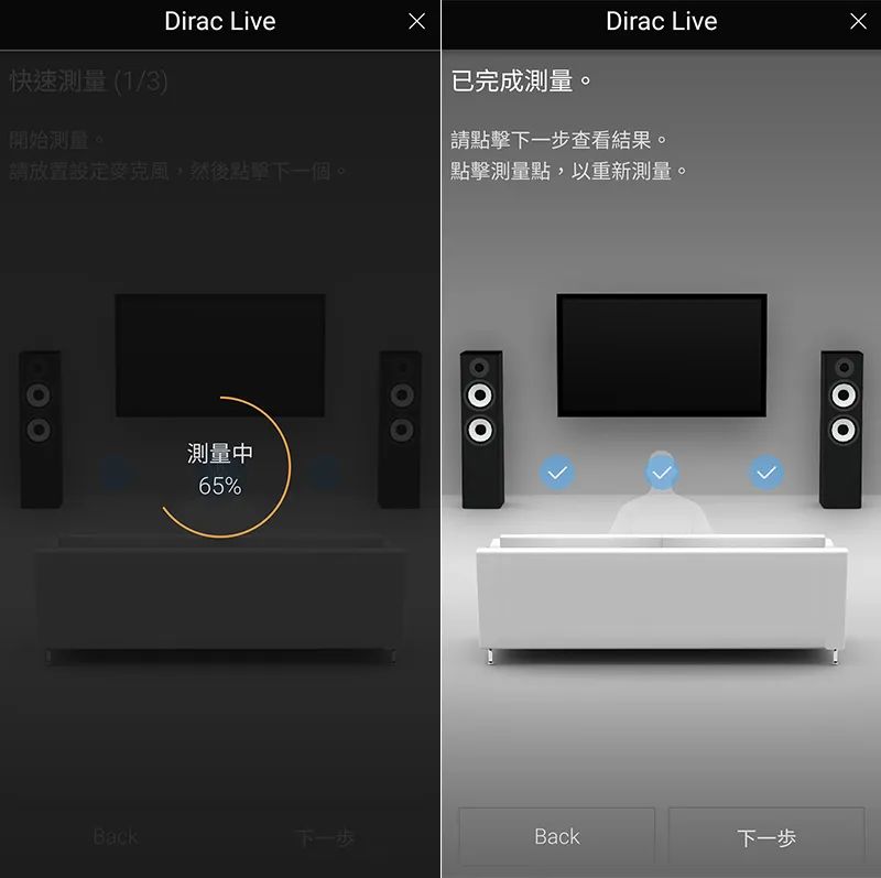 图左:各声道音箱正在发出测试音,麦克风正在收音,过程蛮快的。图右:很快就量完 3 个点了,按下一步即开始运算。 |