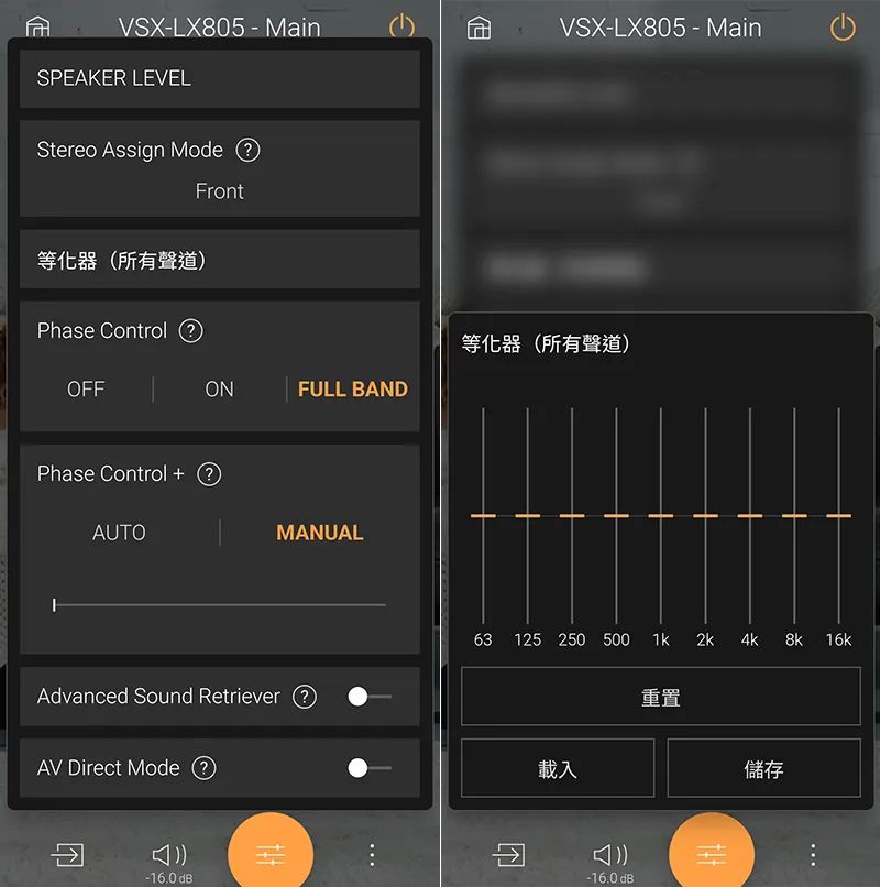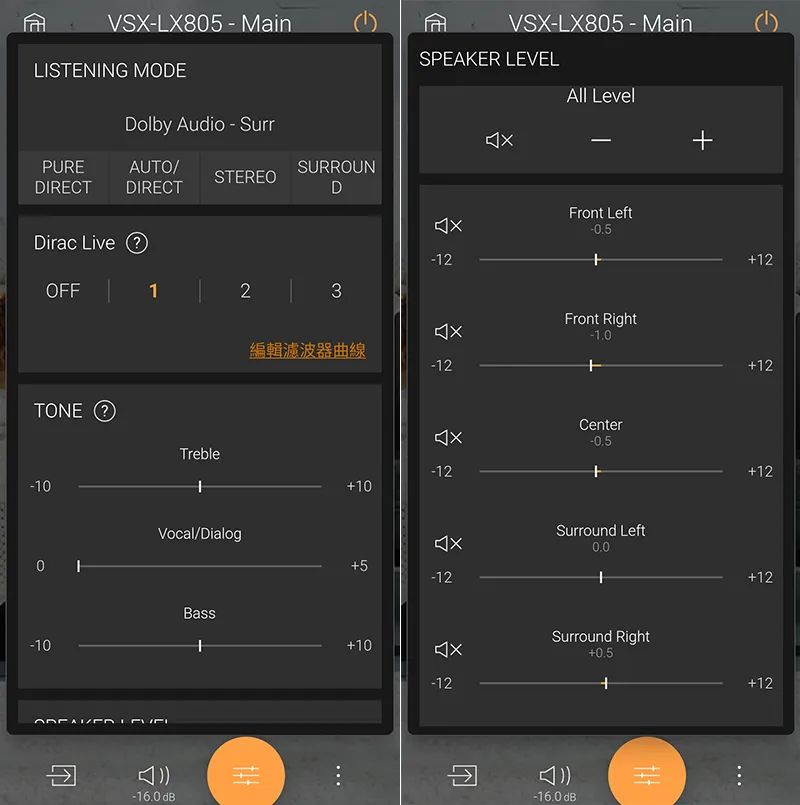 图左:利用 Pioneer Remote app 还能便利地操作许多设定功能,包括声道音校模式、Dirac Live 启闭和档位、高中低音调…等。图右:所有声道的音压也可以微调,比起用遥控器看着荧幕调更方便。 |