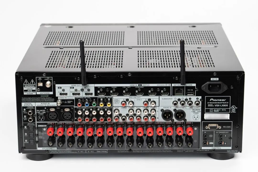 VSX-LX805 是一台 11.4 声道机种,支援包括 Dolby Atmos、DTS:X、IMAX Enhanced、Auro-3D 等最新的多声道音效格式译码,最多可以建置 7.4.4 声道或 5.4.6 声道系统。它采用自家的 Diract Energy 扩大机技术,输出功率 150 瓦(8Ω, 20Hz-20 kHz, 0.08% THD, 2 声道驱动),而且是 AB 类放大,如果你对于现今的 D 类放大仍有疑虑,VSX-LX805 可以让你放心。要是用不了这么多声道呢?VSX-LX805 的功率输出还能做弹性调整,例如你可以将没用到的天空声道端子设成 bi-amp,结合原本的音箱端子用双扩大机驱动左、中、右声道,或者也可以把第二组天空声道端子拿去驱动 2 支被动式超低音,活用弹性很大。此外 VSX-LX805 提供 4 个 RCA 超低音输出端子,最多可设置 4 支超低音音箱,不过当中是 2 个输出为一组,也就是说两组超低音可独立设定,而不是 4 支皆独立设定。