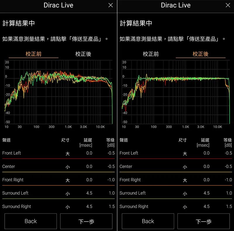 图左:这是 Dirac Live 校正前各声道的频率响应曲线,可以看到不同声道的起伏差异蛮大的。图右:校正后,曲线确实平整了许多。如果觉得这样就可以了,按下一步,即上传至 VSX-LX805 储存。你也可以针对目标曲线做手动调整,然后用不同名称储存。 |