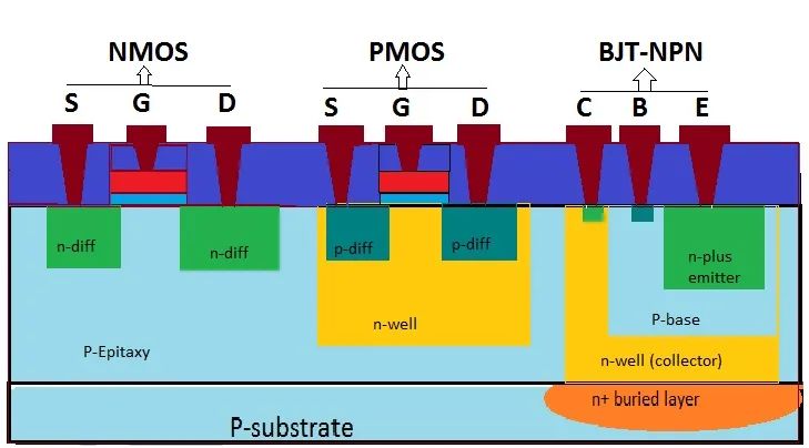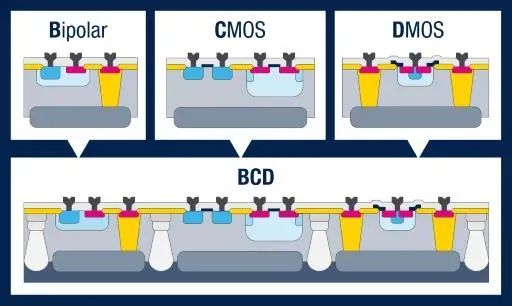 Bipolar-CMOS-DMOS, 这种技术能够在同一芯片上制作双极管Bipolar,CMOS和DMOS器件,称为BCD工艺,1986年由意法半导体(ST)率先研制成功。