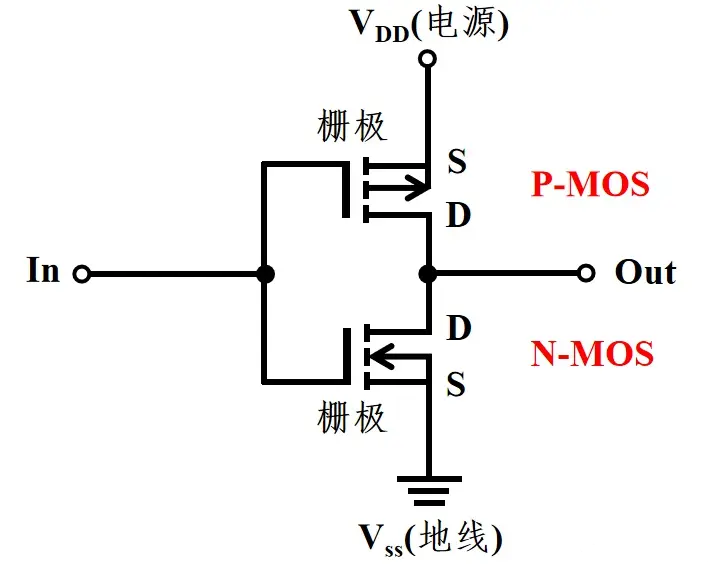 互补型金属氧化物半导体(Complementary Metal Oxide Semiconductor):CMOS技术采用了互补的p型和n型金属氧化物半导体晶体管(MOSFET)来构建电子器件和逻辑电路。下图所示为常见的CMOS反相器,用于“1→0”或“0→1”的转换。