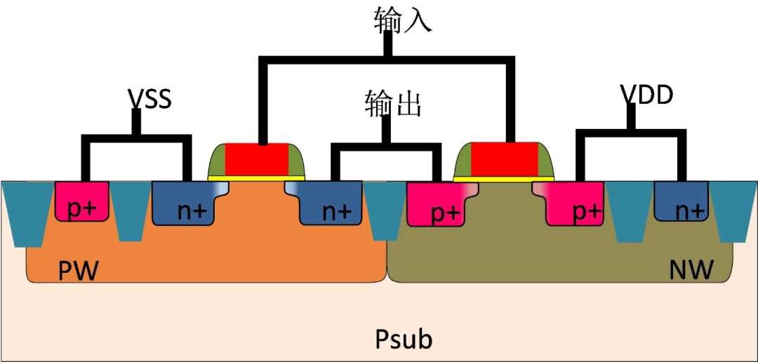 下图为典型的CMOS剖面图。左边是NMS,右边是PMOS,两个MOS的G极连在一起为共连栅极输入,D极连在一起为共连漏极输出。VDD接PMOS的源极,VSS接NMOS的源极。