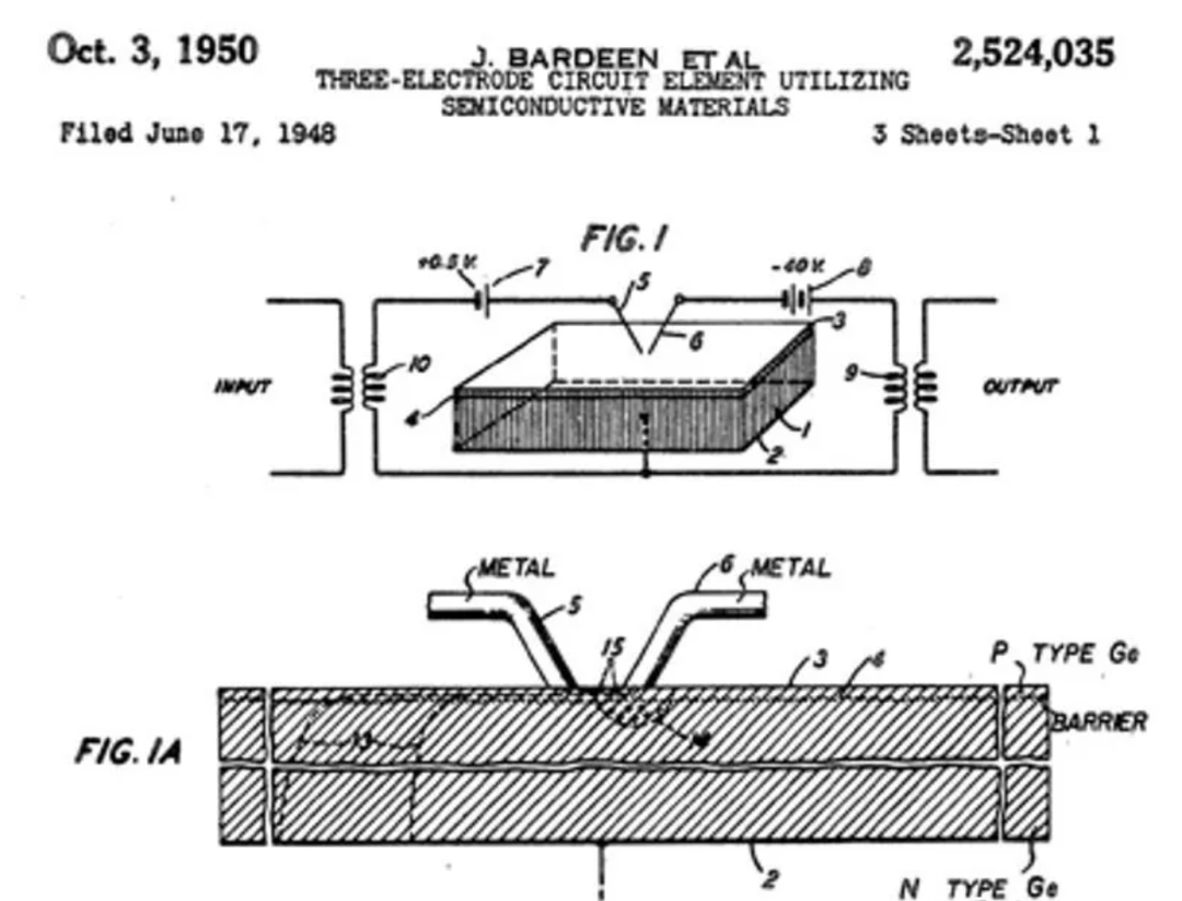 回溯它诞生的历史。由于存在着用固体放大器代替真空三极管这一想法,1945年夏,Shockley提出开展半导体基础研究的建议,1945年下半年,贝尔实验室成立了以Shockley为组长的固体物理学研究小组。在这小组里,不仅有物理学家,也有电路工程师和化学家,包括作为理论物理学家的Bardeen和实验物理学家Brattain。1947年12月,一件被后世认为是里程碑式的事件璀璨地发生了——Bardeen和Brattain成功发明了世界上第一个具有电流放大作用的锗点接触晶体管。