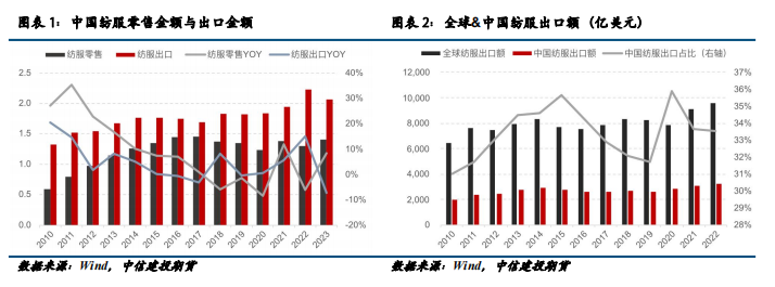 中国纺织服饰在全球市场地位稳固。从相对占比上看,中国纺织服饰在全球纺服出口中的份额占比自2010年起持续提升,近年来维持在33%附近,在全球市场中的地位并没有发生下降。外需一直是中国纺织服饰行业发展的重要抓手,过去20年,中国纺织服饰内外需齐头并进,迅速发展,呈现出“四分看内需,六分看外需”的结构。2023年全年,中国纺织服饰出口额合计2912亿美元,同比下降7.3%。从绝对值上看,中国纺织服饰出口在下滑,但从相对占比上看,中国纺织服饰在全球纺服出口中的份额占比并没有下降。