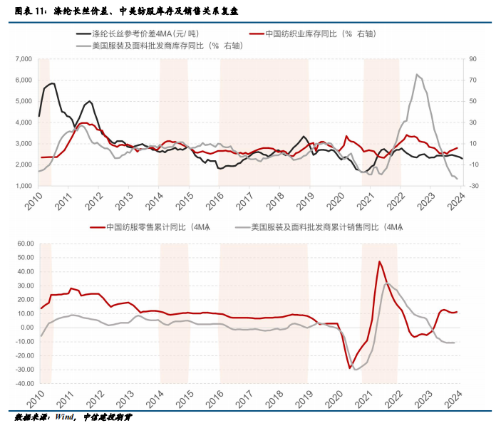 2024年中美纺服库存或将共振,长丝利润有望迎来修复。通过对2010年以来涤纶长丝价差、中美纺服库存和中美纺服销售之间的关系复盘我们发现,通常情况下涤纶长丝利润大幅度的修复需要中美两国纺服同时进入补库周期。自2022年中以来,中美同时进入去库周期,得益于中国疫后需求的爆发,涤纶长丝价差在这期间低位企稳。目前中美两国库存周期拐点或已有所显现,2024年两国纺服可能同时进入补库周期,届时将会对中国纺服出口带来提振,聚酯长丝环节有望迎来利润修复。