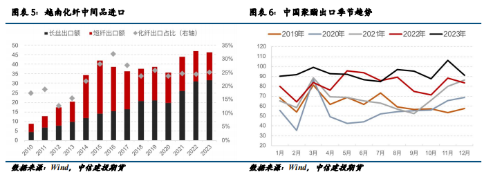 东南亚国家纺服发展难以离开中国,因为中国在聚酯生产方面拥有绝对优势。越南的纺服进口结构显示,化纤长丝、短纤等中间品占据了相当大的比例。截至2023年,中国向越南出口的化学纤维总额达到46.3亿美元,占比约25%。由于化纤行业需要完善的基础设施和炼油设备,东南亚国家由于领土和基础设施建设落后,难以在短时间内发展出规模化的化纤产业链。因此,这些国家对中国聚酯产业链的需求仍然很大。随着东南亚纺服行业的不断发展,中国聚酯纤维的出口增长空间仍然充足。这意味着,对于直接出口服装的依赖度可能会降低。