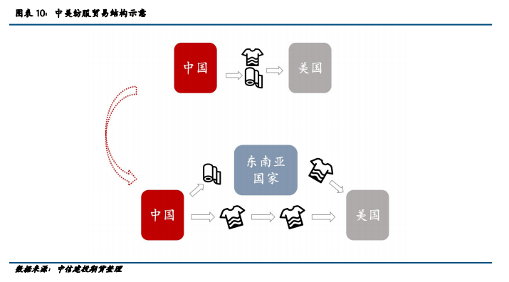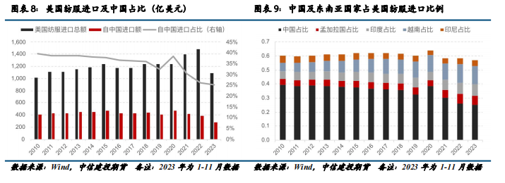 美国纺服进口中中国份额主要流向东南亚国家,实际上仍未脱离对中国的依赖。站在美国视角,中国在美国纺服进口中占比自2010年开始逐年下滑,直观上看美国对中国纺服的依赖度大幅下滑,但实际上减少的份额大多流向了越南、孟加拉国、印度等东南亚国家,2023年1-11月,中国、越南、孟加拉国、印度和印度尼西亚五个国家占美国纺服进口量约57%,相较2010年的60%并未大幅下滑。考虑到东南亚国家纺服生产对中国的高度依赖,美国实际上仍然对中国纺服有极大的依赖度,只是结构上发生了一定转变,由直接从中国进口纺服产品,转向从东南亚国家进口对中国依赖度极高的纺服产品。
