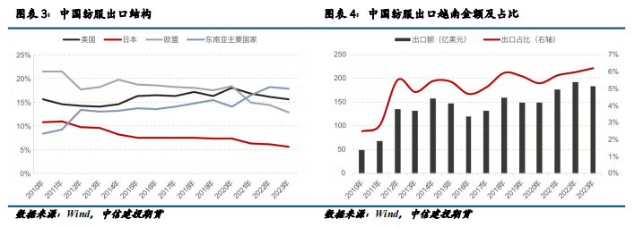 东南亚国家在贸易中的地位不断上升,而美国仍然是中国纺织服饰的第一大出口目的地。2023年,中国对美国的纺织服饰出口额达到463亿美元,占比高达15.67%。与此同时,自2010年起,中国对东南亚国家的纺服出口比例逐年增加,截至2023年,出口金额占比已经达到185亿美元。
