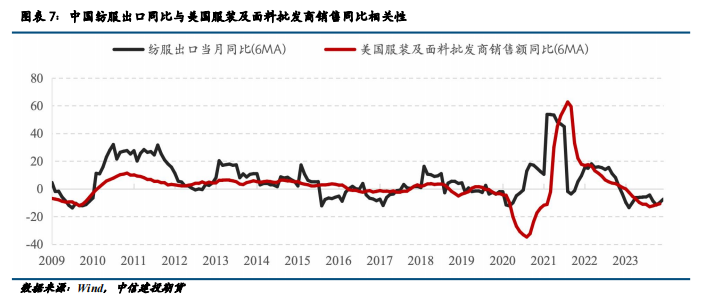 中国纺服出口与美国纺服消费相关性高。如前所述,美国仍是中国纺服出口的首要目的地,从过往数据可以发现,美国服装及面料的销售同比与中国纺织服装出口同比有较高的相关性,美国纺服的销售和库存情况仍是观察中国纺服出口表现的良好指标。