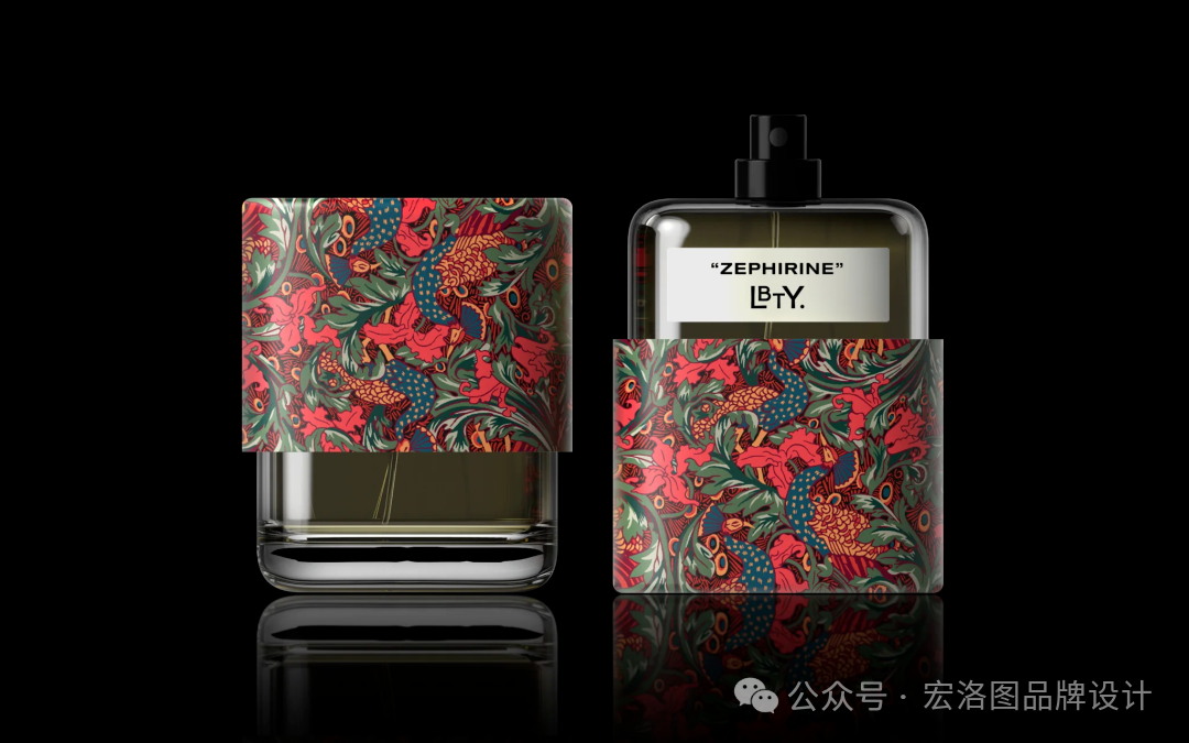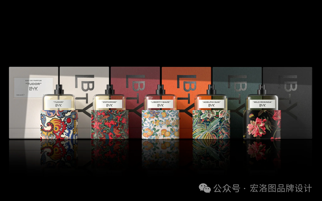 香水系列中的每一款印花都是经过精心挑选的,以激发调香师创造出令人惊艳的香气,这些独特的印花随后被用作香水瓶盖,超大的瓶盖巧妙地作为瓶子的支架,既实用又美观,外包装采用了简约的单色设计,与内部的印花相得益彰,富有创意的排版则成为了一种沉浸式的元素,让消费者打开包装的瞬间就能感受到Liberty的魅力;