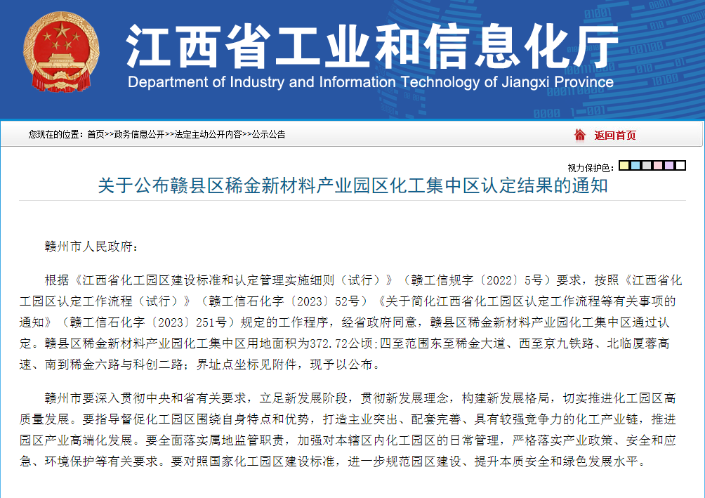 近日,江西省工业和信息化厅等九部门联合印发《关于公布赣县区稀金新材料产业园区化工集中区认定结果的通知》,赣县区稀金新材料产业园区化工集中区通过省级化工园区认定,成为2021年公布全省化工园区名单(第一批)以来我省首个通过省级认定的化工园区。至此,我市已有三个通过省级认定的化工园区。