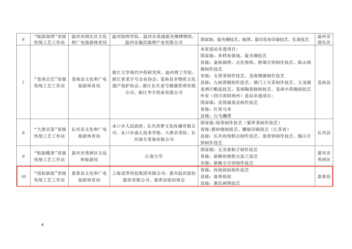 “纽扣新韵”省级传统工艺工作站建设单位为嘉善县文旅局,共建单位包括上海设界科技集团有限公司、嘉兴赵氏纽扣股份有限公司、嘉善县纽扣商会等,涉及传统纽扣制作技艺、盘香纽扣、惠民刺绣技艺等3项非遗项目。工作站办公地址:嘉善县西塘镇大舜辅料创业园17幢