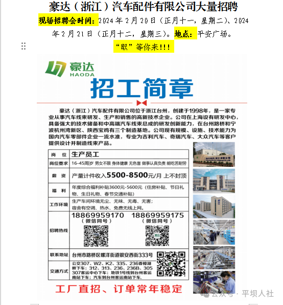 豪达(浙江)汽车配件有限公司大量招聘