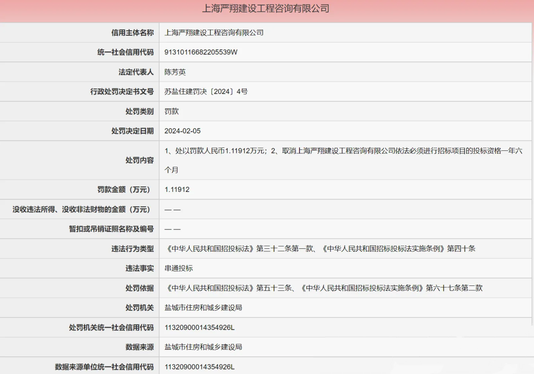 上海严翔建设工程咨询有限公司串通投标,违反了《中华人民共和国招投标法》相关规定,被盐城市住房和城乡建设局,处以罚款人民币1.11912万元;取消上海严翔建设工程咨询有限公司依法必须进行招标项目的投标资格一年六个月。