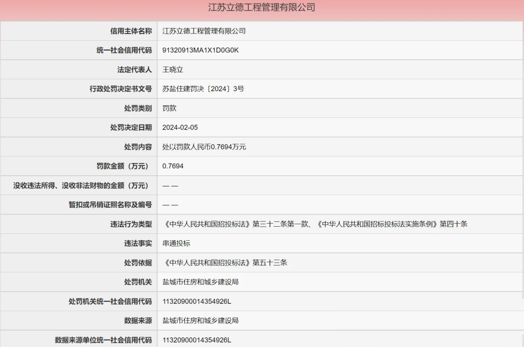 江苏立德工程管理有限公司因串通投标,违反了《中华人民共和国招投标法》相关规定,被盐城市住房和城乡建设局,处以罚款人民币0.7694万元。