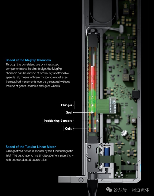 Hamilton推出了一款通过利用磁铁的MagPip移液器,省掉了电机、齿轮等驱动机构,利用磁场驱动活塞杆运动,来实现液体吸入或排出。