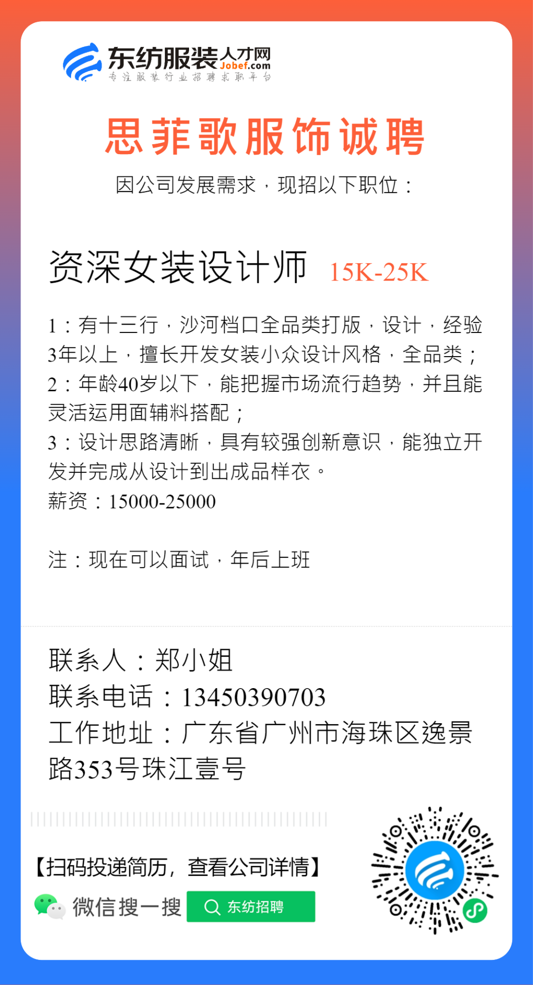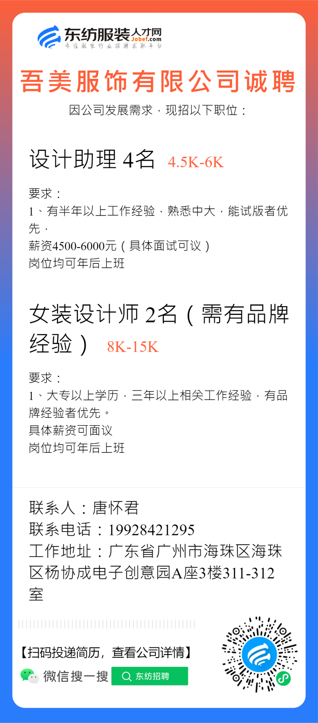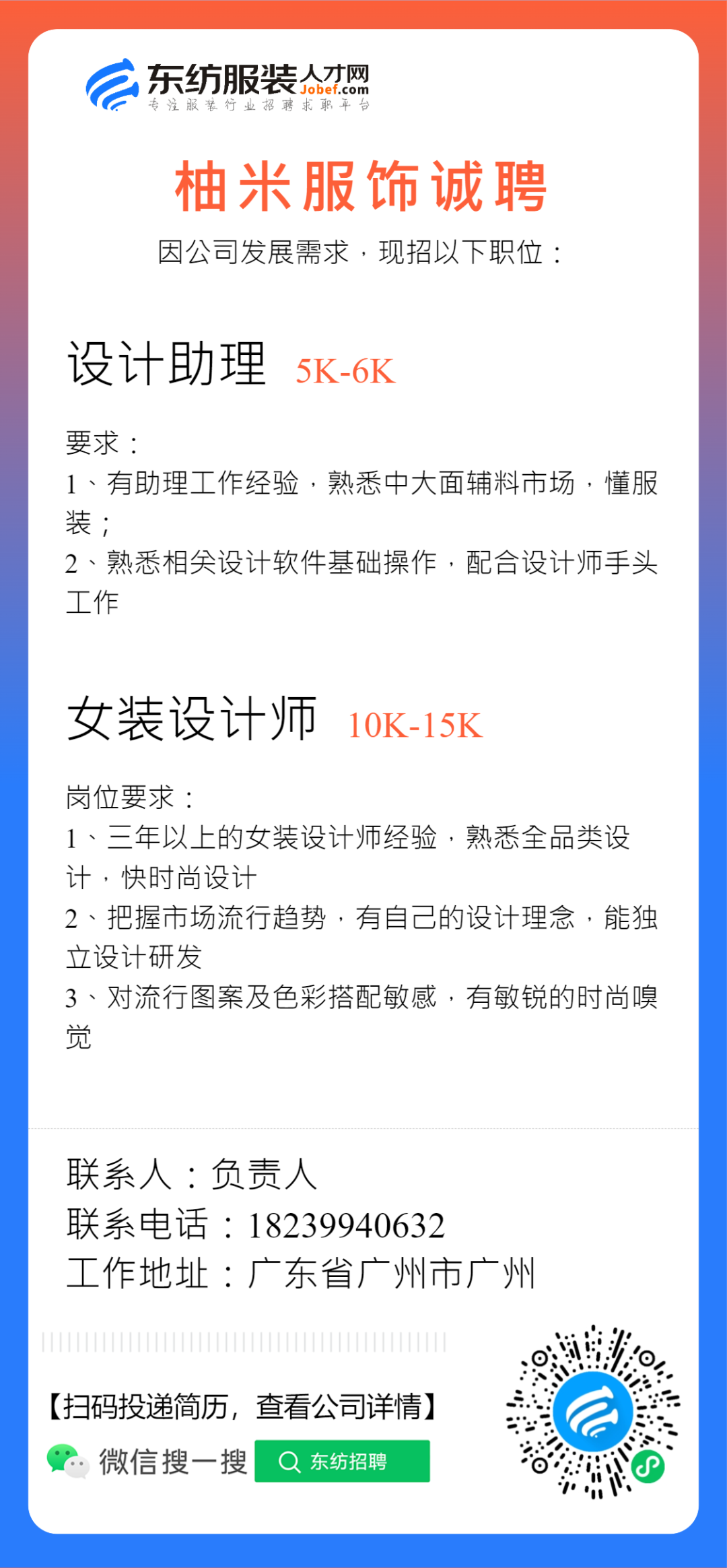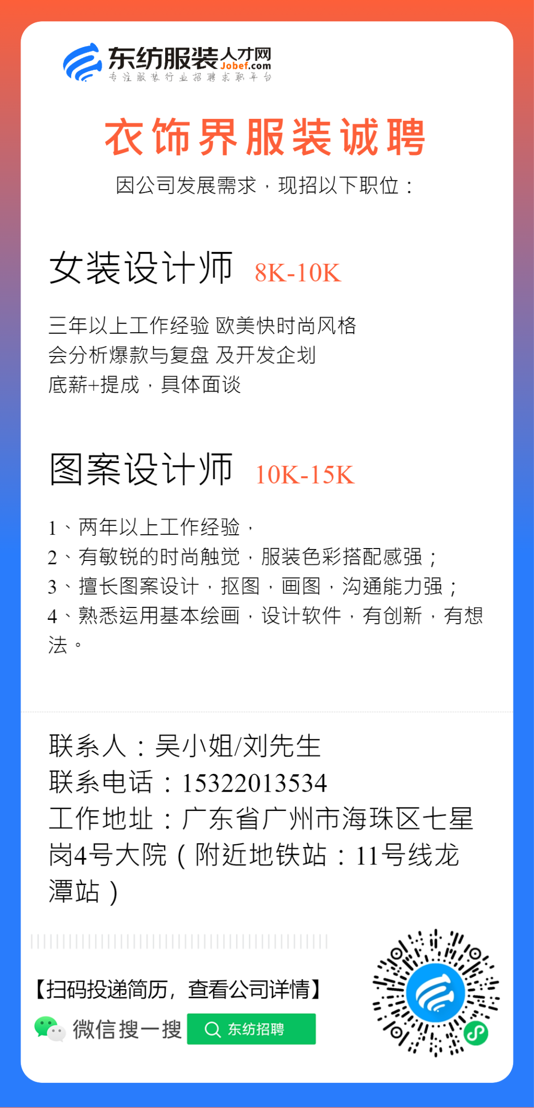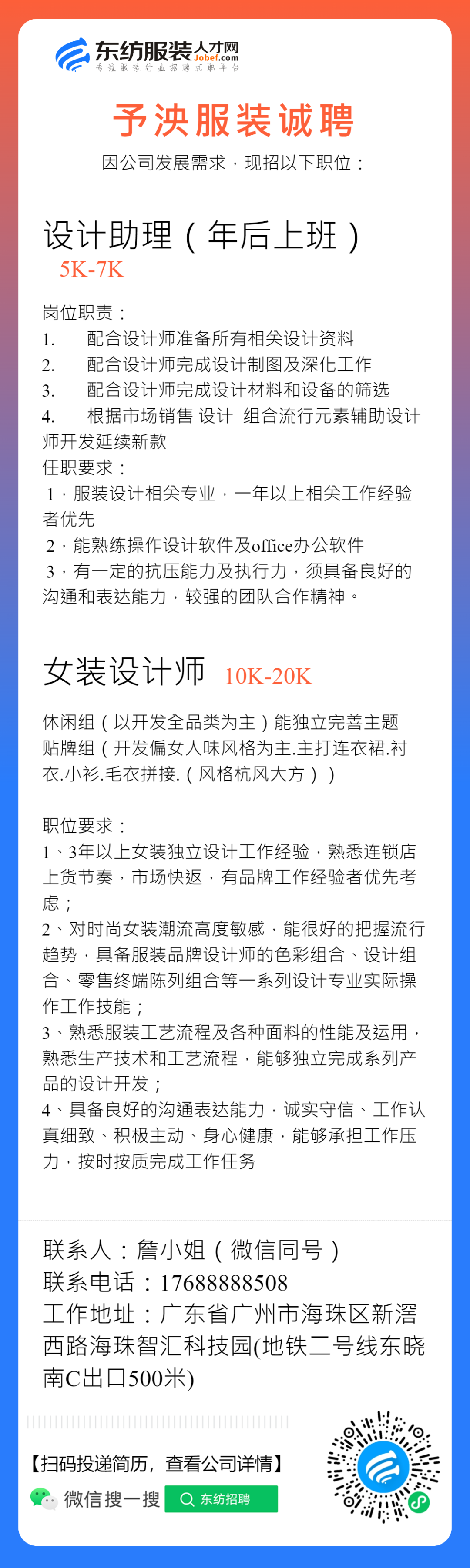服装招聘·设计类丨2. 07号,女装设计师、男装设计师、童装设计师、设计助理.....