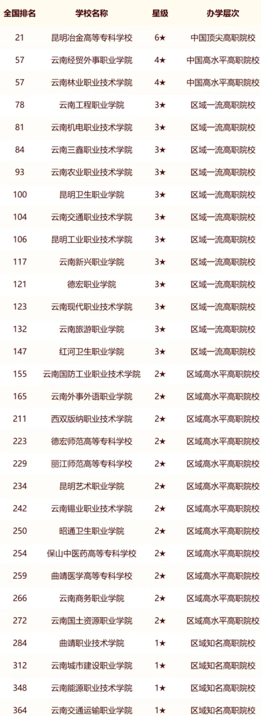 云南机电职业技术学院,源于1910年成立的省立工业学校,1930年更名为昆华高级工业职业学校,1950年更名为昆明工业学校,1959年更名为云南省机械工业学校,1962年与云南省无线电工业学校、昆明电力学校、昆明化工学校和昆明轻工学校等4所学校合并改名为云南省第一工业学校,1979年恢复重建云南省机械工业学校,2004年由原云南省机械工业学校、原云南省机械技工学校两校合并组建为云南机电职业技术学院。位于校友会全国排名81位。