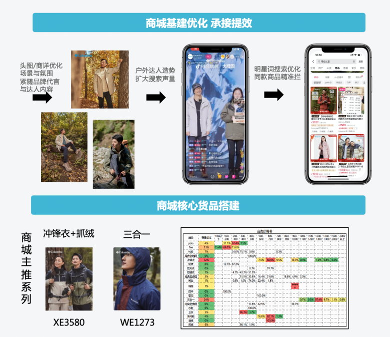 找到爆品后,如何让爆品被更多用户看到呢?搜索是关键触点。为创作更多的搜索流量,商家联动内容场,借助明星、达人同款宣发以及专场直播打造,激发达人词、品牌词以及品类的搜索流量,引导用户产生“主动搜”行为。同时,做好“看后搜”运维,一方面发布短视频时使用#Columbia、#户外穿搭等推荐话题,提升商品、店铺的曝光;一方面引导用户留评论,形成品牌+产品的超链接,缩短“种草-拔草”的消费链路,带动高转化。活动期间(10.14-10.29)无穷小亮同款销量超8000件。搜索流量爆发后,商家还通过科学布局商城和店铺,吸引用户“主动逛”,高效承接精准流量。