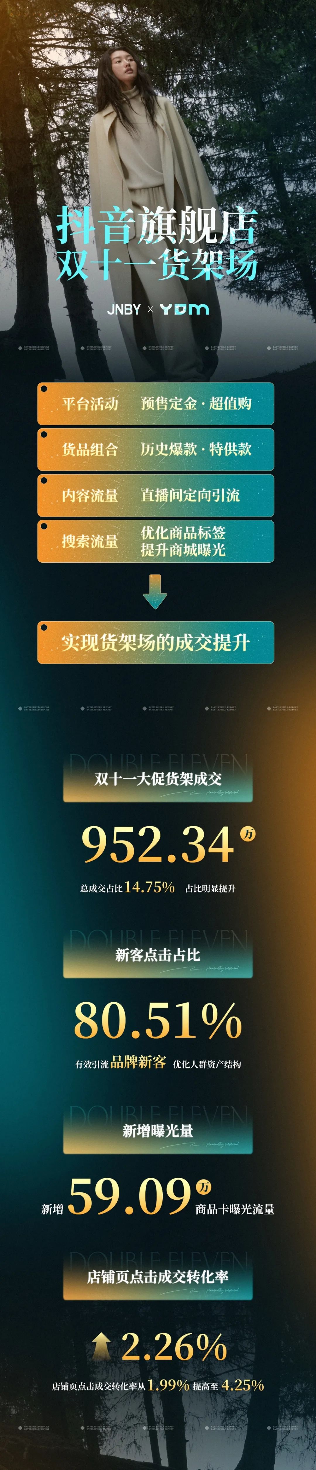 此次活动中,品牌借势双11大促势能,针对新老客户的不同的特点给予不同的优惠福利,不仅实现了品牌人群资产结构的优化,还提高了用户粘性和成交转化率,为品牌的长效发展打下坚实的基础。活动期间,店铺点击成交转化率从1.99%提高至4.25%。