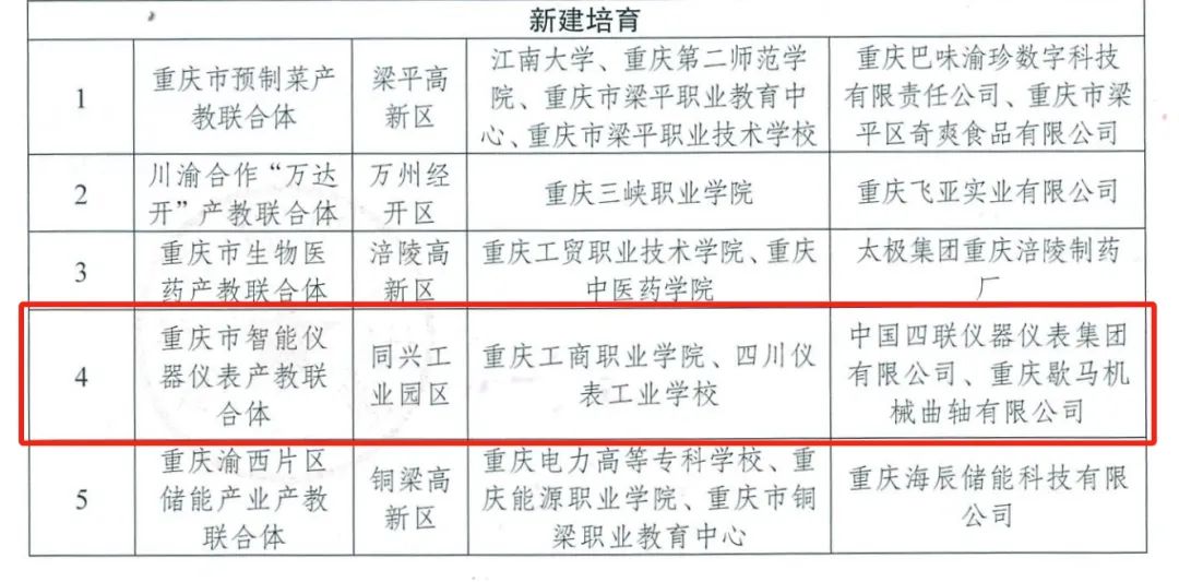 重庆市智能仪器仪表产教联合体是由同兴工业园区牵头,重庆工商职业学院、四川仪表工业学校为主要参与学校,中国四联仪器仪表集团有限公司、重庆歇马机械曲轴有限公司为主要参与企业的集“产、学、研”功能为一体的联合体组织。联合体立足同兴工业园区,服务全市仪器仪表产业发展,具有增长速度高、发展质量高、育人水平高、合作起点高的“四高”特点。