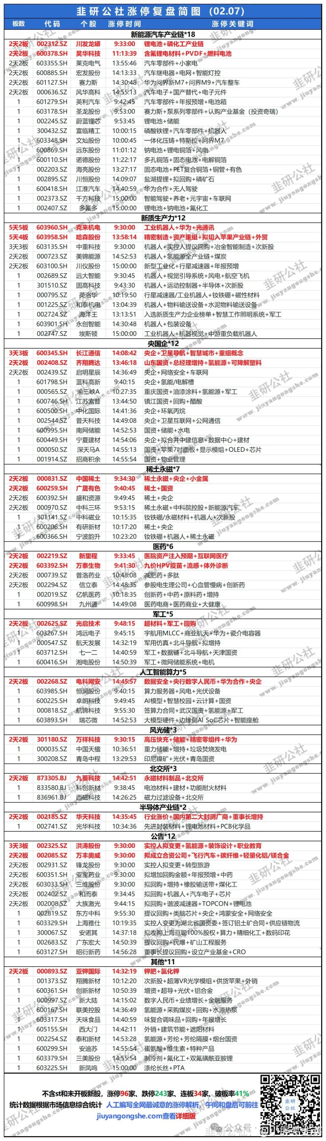 今日96股涨停,60股炸板,封板率为61%,克来机电5连板,中重科技、长江通信3连板,万祥科技20CM2连板,北交所九菱科技30CM2连板,中科磁业、青岛中程、安诺其、固高科技、富临精工20CM首板,北交所西磁科技、科创新材30CM首板。盘面上,两市超2100家个股上涨;板块方面,稀土永磁、超导、大基金持股、中字头等板块涨幅居前,新型城镇化、PEEK材料、建筑节能、注册制次新股等板块跌幅居前。
