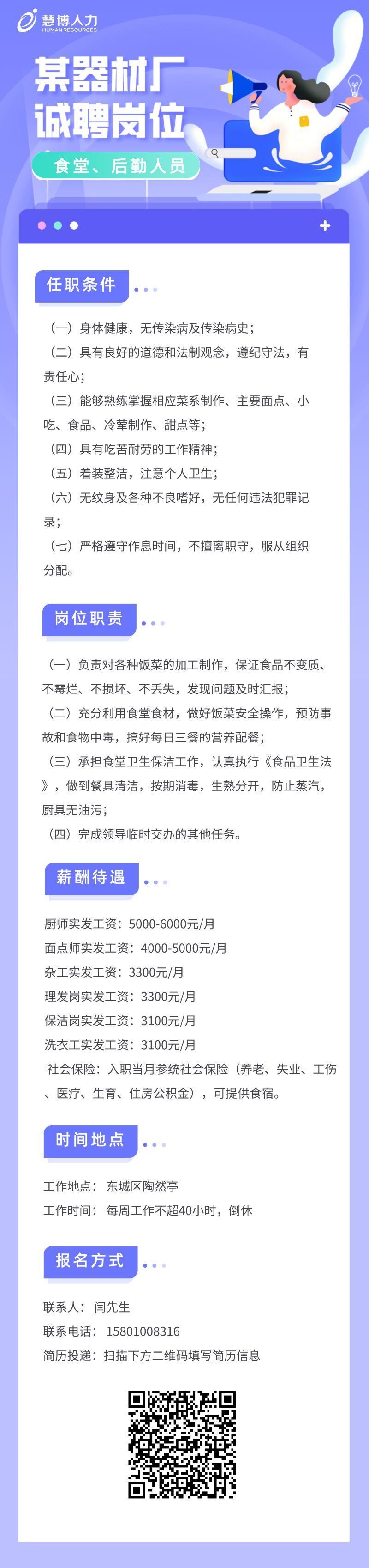某器材厂诚聘食堂、后勤人员