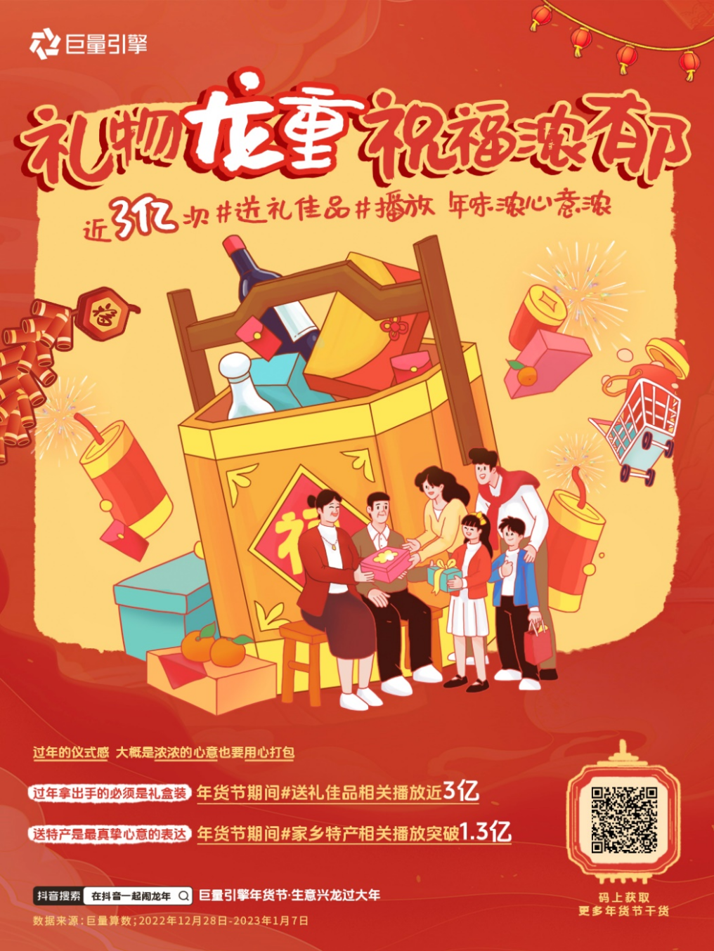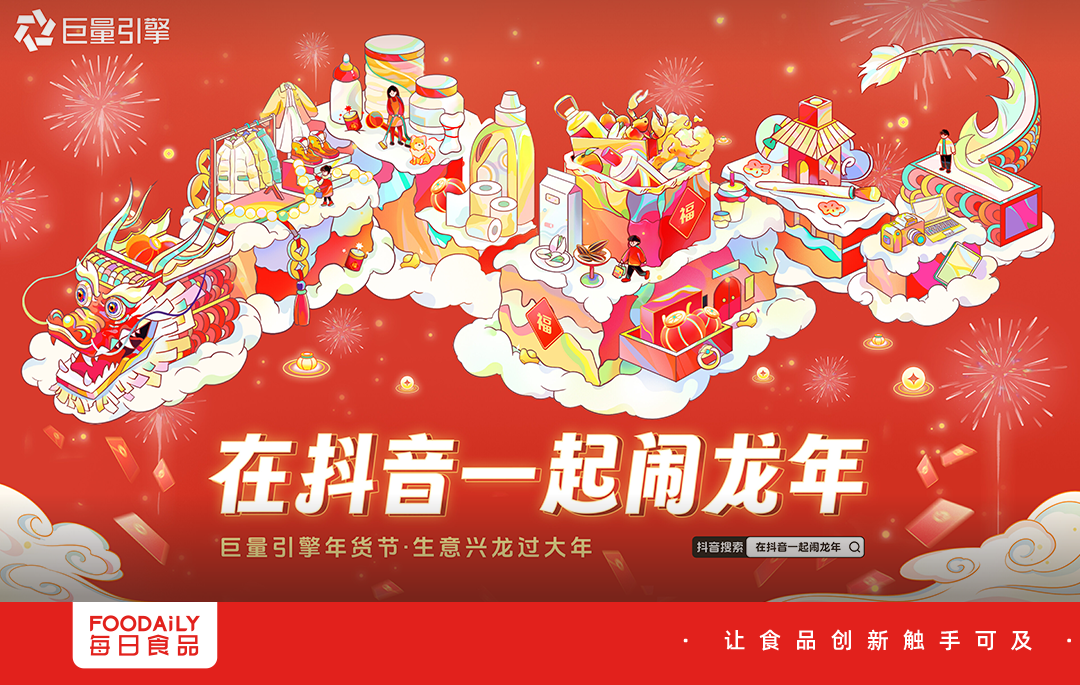 年货需求激增之下,巨量引擎一年一度的年货节已在去年12月拉开大幕。本届年货节以「在抖音一起闹龙年」为核心主张,为商家提供年货节实战策略及核心产品,帮助品牌商家赢下年货生意,收获2024 开门红。