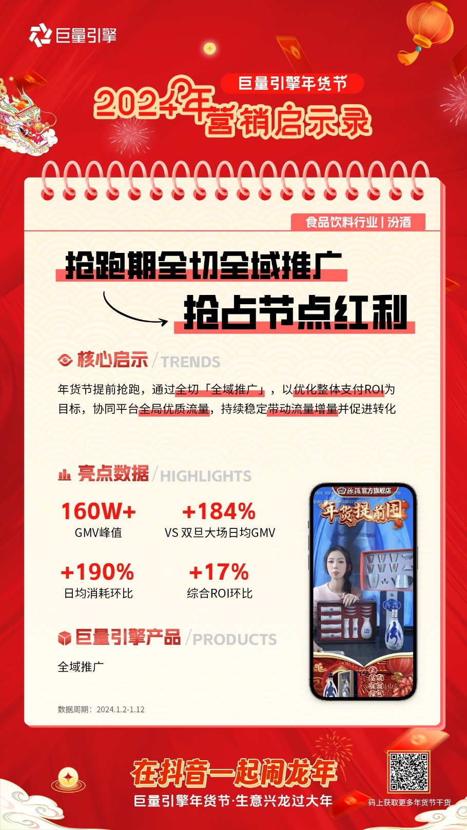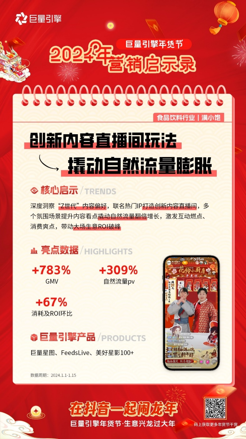 事实上,针对不同定位、不同类型的商家,巨量引擎都有定制化的营销方案。在年货节复盘收官阶段,巨量引擎聚焦食饮、日化母婴、服饰三大赛道,对年货节期间的品牌案例进行了深刻剖析与总结,特别推出「巨量引擎2024年货节营销启示录」。