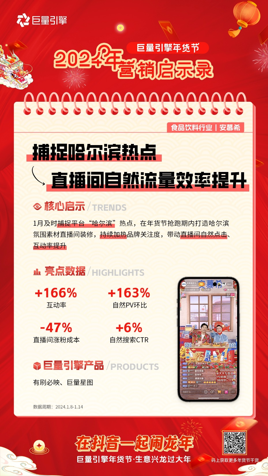 今年元旦,“尔滨”爆火。各类含“东北元素”的视频在抖音上持续火热,成为商家最好用的流量密码。一直善于捕捉热点的常温酸奶领军者安慕希,不仅通过“冰雪节”在抖音平台进行多维度的冬日营销,在年货节抢跑期内,也花大力搭建尔滨氛围拉满的直播间。安慕希借势抖音平台和明星艺人热度打造哈尔滨大场,借助巨量引擎「有刷必映」带动私域沉淀,持续加热品牌关注度,实现直播间互动率提升 166%,直播间涨粉成本降低 47%,为生意带来长效增长。